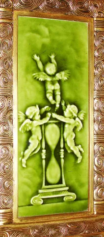 New Haven Clock Co., New Haven, Conn., "No. 1017" model, Asian influenced cast bronze case with green Aesthetic period Chelsea art tiles manufactured by J and G Low, Chelsea, Mass., the tiles depicting clouds, hovering and flying putti, and an hourglass,