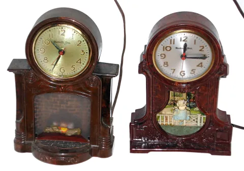 Clocks- 2 (Two) MasterCrafters, Chicago, Ill, plug-in electric automaton timepieces: swinging doll and fireplace, c1950. wood-grain phenolic cases are in nice undamaged condition; dials, glasses and cords are okay. Not tested, and care should be taken when first plugged in. Ht 10"