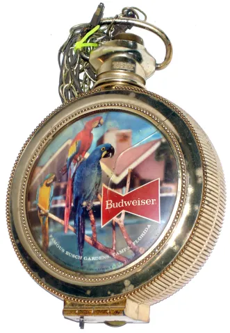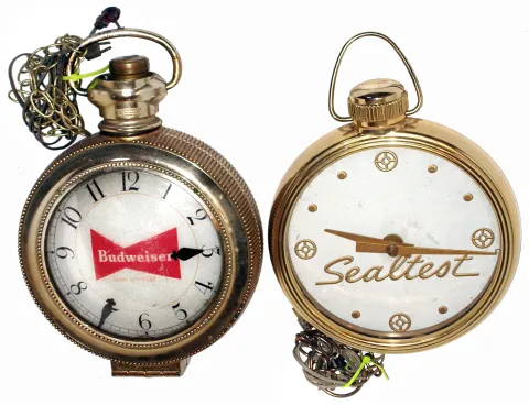 the Sealtest is in the mystery clock form with hands floating in the center of the glass dial. The illuminated Budweiser is two sided, with a cracked...