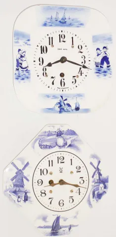 Clocks- 2 (Two) Irving Miller & Co., New York, Delft plate 8 days, time only, kitchen wall clocks, c1930