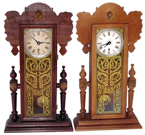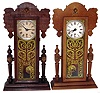 we cannot find much information about this maker, and the movements are from Japan, but the paper dials are signed "Mfg. Par Aro Inc. - Canada" and the cases are unusual elongated variations of earlier Connecticut parlor clocks. This pair offers a choice of light and darker finishes. Ht 27"
