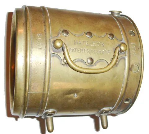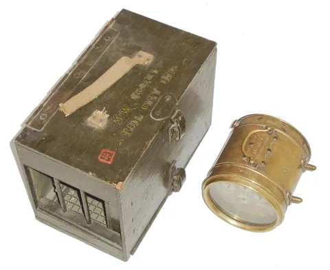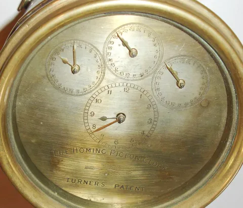 The Homing Pigeon Clock, Turner's Patent and Hateley's Patent, brass clock for timing bird flights, with painted wood carrying case for pigeons, c1900(?)