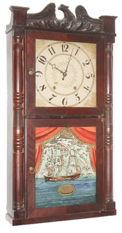 William Beach, Hartford, Conn., 30 hour, time and strike, wood movement double door half column and carved splat shelf clock, c1834