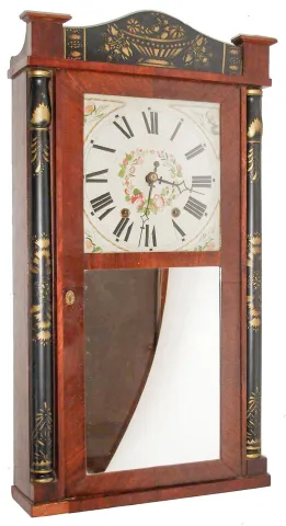Mahogany veneered case with some veneer loss on the base. Stenciling on the columns and splat has been restored. Original painted dial is very clean and the hands are original. Ht 30.5"