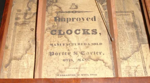 Porter & Carter, Otis, Mass., 30 hour, time and strike, weight wood movement half column & splat shelf clock, c1835 Mahogany veneered case with some veneer loss on the base. Stenciling on the columns and splat has been restored. Original painted dial is very clean and the hands are original. Ht 30.5"