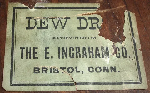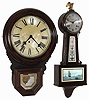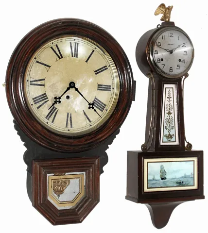 Clocks- 2 (Two) Connecticut wood 8 days, wall clocks: New Haven "Whitney" striking banjo, c1932; E. Ingraham "Dew Drop" rosewood grained time only, c1900 both clocks have their original finishes, dials, pendulums, and glasses in good condition, and partial rear labels. The Dew Drop's backboard behind the pendulum has been painted silver. Hts 29" & 24"