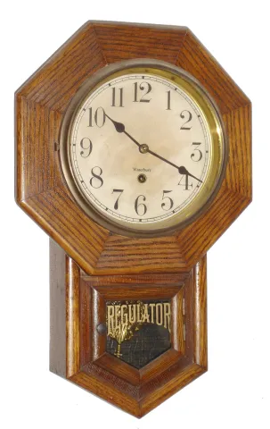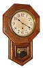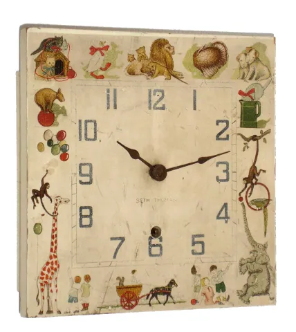 Clocks- 2 (Two): Waterbury Clock Co., "8 Inch Drop", 8 day, oak case school house type wall timepiece, c1910 and a Seth Thomas Clock Co., "Nursery" spring driven wall clock with painted wooden dial depicting circus animals