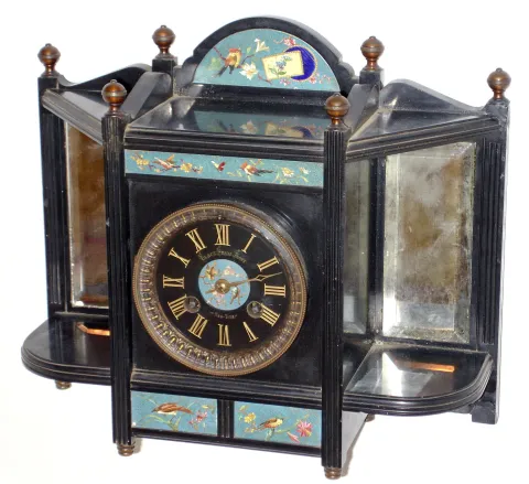 French black marble 8 days, time and strike, mantel clock, dial signed "Black, Starr & Frost, New York", c1890 this unusual cabinet-style case has little side shelves, beveled mirrors and cloisonne panels. One rear top corner has been repaired, the old mirrors show some age to the silvering, and the tip of the hour hand is absent. The movement has an unusual rear lever allowing the pendulum to be started from a little square arbor below the 6. Ht 11.5"