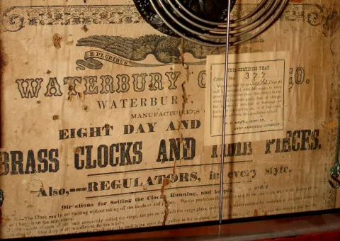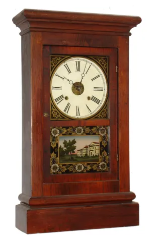Waterbury Clock Co., Waterbury, Conn., 30 hour, time and strike, weight rosewood veneered cornice shelf clock. c1865