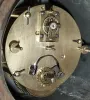 French, for "J.B. Welch, Burslem" carved wood 8 days, timepiece and barometer wall hanging set, c1910 the carving on this thick heavy piece is intricate and well done, with a good glossy finish, and one okay repair at the very bottom. The clock hinges out for rear winding and setting; the balance platform is intact and ticks. The beveled glasses and white dials are good with fine lettering, the U.K. retailer name, and a dual-scale thermometer on the barometer face. Ht 29"