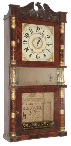 Mahogany veneer case in as found condition in need of restoration. There is veneer loss on the base, at the bottom door and couple of the small blocks that support the columns. The middle gilt columns have a fair amount of loss. Bottom glass and the mirror are original. Original painted dial is very clean. Hands are original. Nicely carved eagle splat. Clean label inside case. Ht 39"