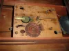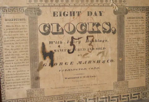 George Marsh & Co., Farmington, Conn., 8 day, time and strike, weight wood movement triple decker shelf clock. c1834 Mahogany veneer case in as found condition in need of restoration. There is veneer loss on the base, at the bottom door and couple of the small blocks that support the columns. The middle gilt columns have a fair amount of loss. Bottom glass and the mirror are original. Original painted dial is very clean. Hands are original. Nicely carved eagle splat. Clean label inside case. Ht 39"