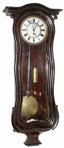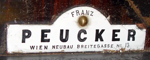 Franz Peucker, Wien, Austrian walnut 8 days, time only, weight driven Vienna Regulator wall clock, c1890 the Peucker name appears on the white porcelain beat scale along with the address "Neubau Breitegasse No.13". The unsigned movement, with maintaining power, is numbered 10673. The serpentine case retains its old dark finish with some age and shrinkage cracks, the finials are absent, and one glass side panel has a small piece missing. The porcelain dial has one faint hairline. Ht 36"