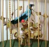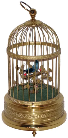 Singing Animated Bird in Brass Cage, Germany, "K-G" and "KEN.D" bottom trademarks, c1955 the lacquered brass cage is very nice, as are the feathered bird and foliage inside. The bird whistles, turns and twitches when the bottom key is wound. Ht 13"