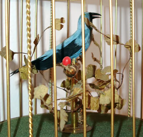 Singing Animated Bird in Brass Cage, Germany, "K-G" and "KEN.D" bottom trademarks, c1955