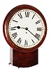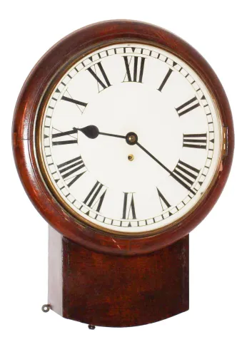 English drop dial 8 days, mahogany hanging timepiece with fusee movement, c1900 the solid mahogany retains its original finish, the unsigned painted metal dial is very good, and the hands are correct. The movement has a gut cord to the fusee and the original heavy pendulum. One wood retaining peg for the dial assembly is absent (minor issue). Ht 19"