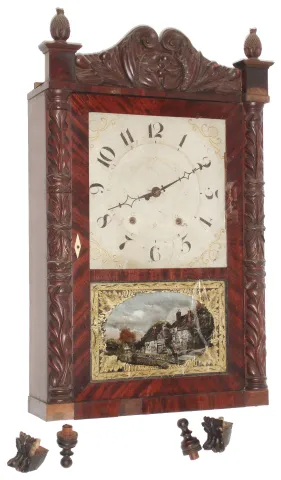 Ephraim Downes for George Mitchell, Bristol, Conn., 30 hour, time and strike, weight wood movement short Carved column and splat shelf clock, c1830 Mahogany and mahogany veneered case in good condition with loss of veneer on the base, the door and just below the crest. Original painted dial with general wear and some loss and scratches. Tablet is original, but cracked and the only original part is the gold leaf border. Movement is original to the case. One of the pineapple finials has a little damage. There is a set of feet with this clock that can be made to fit. The back turned feet look to be original as they fit the existing holes. The front paw feet are too short which means that you will have to shorten the rear feet to match the height. Ht 27"