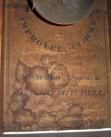 Ephraim Downes for George Mitchell, Bristol, Conn., 30 hour, time and strike, weight wood movement short Carved column and splat shelf clock, c1830