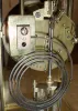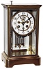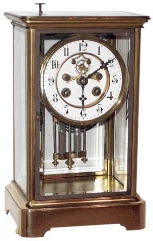 French brass and beveled glass 8 days, time and strike, crystal regulator, S. Marti movement with visible escapement, c1900 similar to the push button repeat found on French carriage clocks, the feature is rarely seen on these larger mantel clocks and may be custom-made by a skilled craftsman. The lacquered brass case has a glossy patina with very small areas of tarnish. Two of the beveled glass panels have small chips at their top edges. The compensating pendulum is fine, the white porcelain dial has a few faint hairlines, the pallets are red jewels. The movement has the Medaille de Bronze stamp. Ht 10"