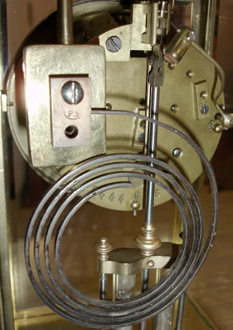 similar to the push button repeat found on French carriage clocks, the feature is rarely seen on these larger mantel clocks and may be custom-made by a skilled craftsman. The lacquered brass case has a glossy patina with very small areas of tarnish. Two of the beveled glass panels have small chips at their top edges. The compensating pendulum is fine, the white porcelain dial has a few faint hairlines, the pallets are red jewels. The movement has the Medaille de Bronze stamp. Ht 10"