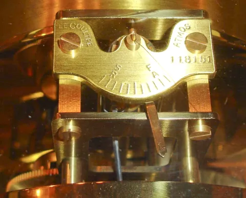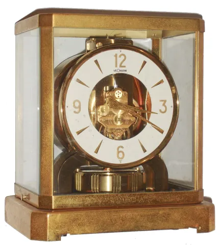 Jaeger-LeCoultre Swiss "Atmos" table clock, jeweled movement runs on changes of atmospheric pressure and temperature, gold-plated brass and glass case, serial number 118151, c1965
