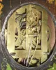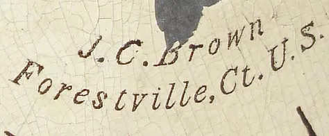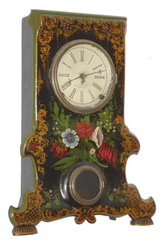 J. C. Brown, Forestville, Conn., 8 day, time and strike, painted iron front shelf clock, c1845 Nicely decorated case of an unusual design in very nice condition. Original painted dial with some loss and repair in the center and the outer edges. Movement is signed. Hands are original. Ht 16.5"