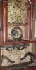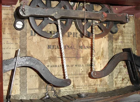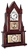 Mixed lot of a double steeple with a wagon spring movement, c1850 This looks to be a steeple clock case mounted on a homemade or parts from another steeple and fitted with a wagon spring movement and fitted with a backboard from a Daniel Pratt, Jr. shelf clock. The backboard looks to be from a wooden movement clock. The leaves to the leaf spring look to be made out of modern steel. If you need a wagon spring movement for your empty case this might work. Ht 27"