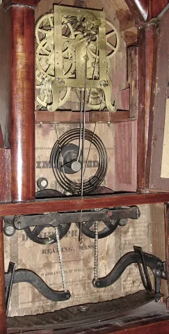 This looks to be a steeple clock case mounted on a homemade or parts from another steeple and fitted with a wagon spring movement and fitted with a backboard from a Daniel Pratt, Jr. shelf clock. The backboard looks to be from a wooden movement clock. The leaves to the leaf spring look to be made out of modern steel. If you need a wagon spring movement for your empty case this might work. Ht 27"