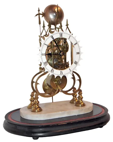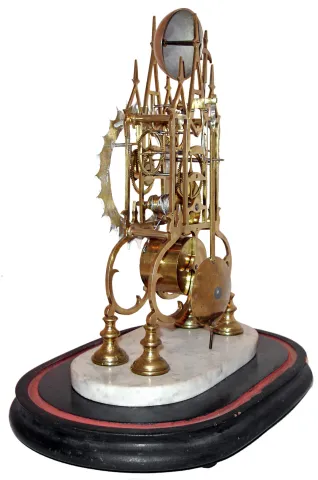 English skeleton clock, 8 days, fusee spring driven movement with pendulum and passing strike on the hour, mounted on oval marble base set on wooden base (no dome), c1870 the dial has been repainted. The passing strike needs attention. There is no dome. Ht 16"
