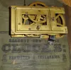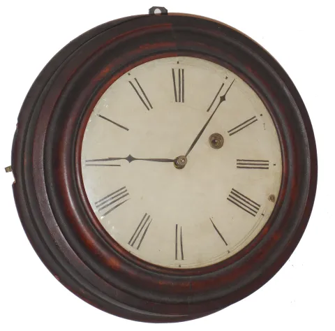 Brewster and Ingrahams, Bristol, Conn., 8 days, gallery timepiece, walnut bezel, c1850 the turned walnut bezel has its old original finish, now dark and with some scrapes and dings. The original painted wood dial is very nice for its age and retains a faint partial signature. The brass east-west movement is stamped with the company name. Good green inside label. Diameter 14"
