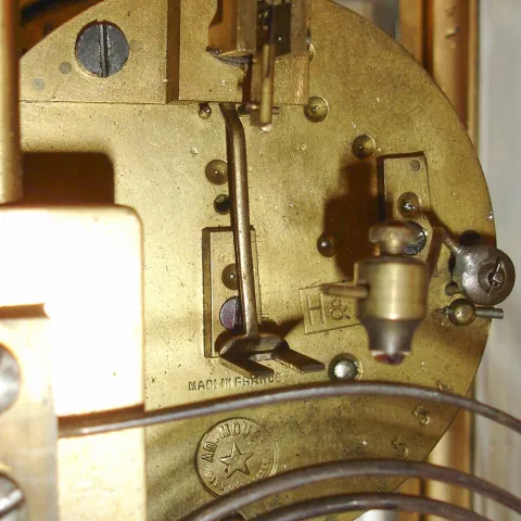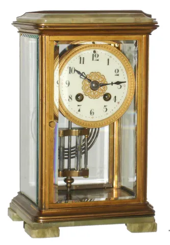 France, crystal regulator, gilt brass case with green onyx top and bottom, thick beveled glass sides, 8 days, rack striking pendule a Paris movement, counting the hours on a gong, with a single blow at the half hour, movement signed "AD. MOUGIN Deux Medailles" also with "H&H" mark, white enamel dial with Arabic numerals, gilt bezel and center ornament, blued steel hands, with 2 vial mercury pendulum, c1910 Gilding dirty and with minor losses, dark staining at back on inside and on base molding, front glass with chip at upper right corner, onyx top original and in good condition, onyx base replaced, dial good with hairline at 12:00, minute hand replaced, movement ticks and strikes, warning lever sticky and does not always fall to release the train, needs cleaning, pendulum with lower decorative nuts missing and one spacer missing, Ht 8 7/8"