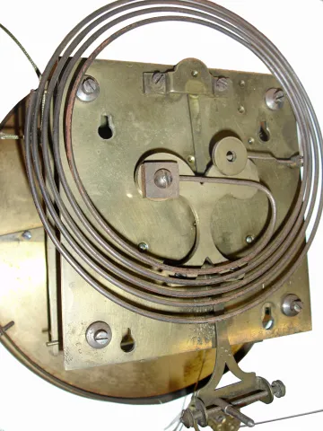 there is an old finish on this elaborate case, with minor scratches but no losses. One side glass panel is broken, and the front glass is later. The porcelain dial is fine, the weights have an old dark patina, the black painted wood pendulum stick is original, and the movement, with its rear mounted coil gong, is signed. Ht 42"