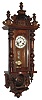 Werner, Germany, 8 days, time and strike, spring driven R/A wood wall clock with large bell below, Asian letters on dial, c1890 this fancy and unusual dark stained case, with original old surface, may have been custom-fit with its lower components and big bell, perhaps for an Asian customer whose name may be on the white porcelain dial. The movement has the Werner horseshoe trademark, but the connection to the bell looks home-made. The gridiron pendulum and beat scale have good celluloid prints. Ht 36"