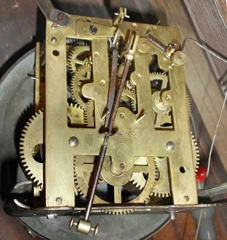 this fancy and unusual dark stained case, with original old surface, may have been custom-fit with its lower components and big bell, perhaps for an Asian customer whose name may be on the white porcelain dial. The movement has the Werner horseshoe trademark, but the connection to the bell looks home-made. The gridiron pendulum and beat scale have good celluloid prints. Ht 36"