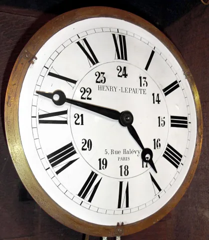 Henry Lepaut, 5 Rue Halevy, Paris, France, tall clock, 8 days, time only, weight driven heavy brass movement with pinwheel escapement and rope winding in an oak case with white enamel dial with maker's signature, c1870 the case has an excellent old finish. The movement is very high quality and signed. The dial has one light hairline. The weight may be a replacement. Ht 89 1/2"