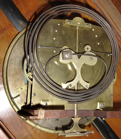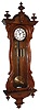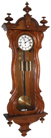 Austrian carved wood 8 days, quarter striking 3 weight serpentine case Vienna regulator, c1880 this large case has been nicely refinished, but needs tips for two of its top finials and one glass side panel. The two other glasses are new. The porcelain dial has some hairlines, and the hands are incorrect. The brass weight shells are tarnished, the pendulum bob is shinier. The quality movement strikes on coil gongs mounted behind. Ht 59"