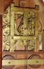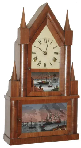 Elisha Manross, Bristol, Conn., 8 day, time and strike, fusee strap brass movement double steeple shelf clock, c1845 Mahogany veneered case in nice condition in an old finish with some minor veneer loss on the base and a chip on the lower door. Original painted dial with some minor loss at the mounting pins and the winding arbors. Hands are original. Both tablets are original, although the bottom tablet has a corner crack. Nice clean label inside case. Ht 23.5"