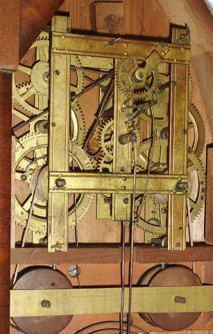 Mahogany veneered case in nice condition in an old finish with some minor veneer loss on the base and a chip on the lower door. Original painted dial with some minor loss at the mounting pins and the winding arbors. Hands are original. Both tablets are original, although the bottom tablet has a corner crack. Nice clean label inside case. Ht 23.5"