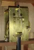 Rosewood grain painted case in original finish with abrasions to the finish on the bottom door corner and on the bottom area of the dial door. Original painted dial has darkened on the edge with some loss at the mounting screws. Original tablet is cracked. A very nice embossed pendulum and a very clean label inside the case. Hands are original. Ht 34"