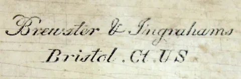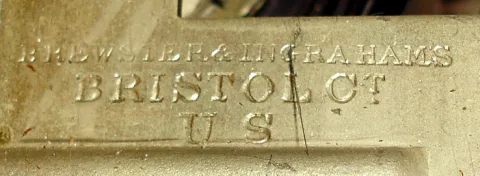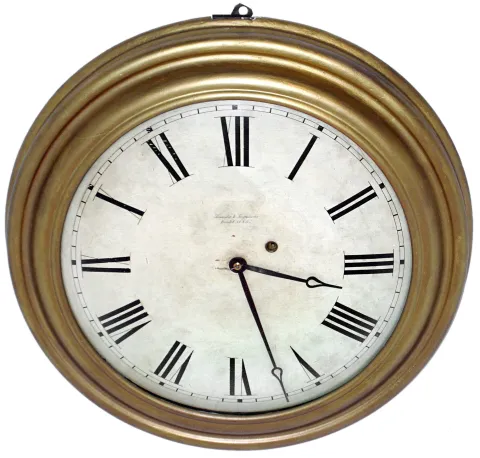 Brewster and Ingrahams, Bristol, Conn., 8 days, time only, spring driven 22" gilt gallery clock, c1850 this is the largest version of this style, and retains its original east-west movement, signed wood dial, hands and factory label. The convex glass is old and bubbly, the hardware is old except for the bottom catch for the bezel, and the gilt finish has been restored. There are two interesting dealer labels inside, too. Overall diameter 22"
