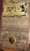 this is the largest version of this style, and retains its original east-west movement, signed wood dial, hands and factory label. The convex glass is old and bubbly, the hardware is old except for the bottom catch for the bezel, and the gilt finish has been restored. There are two interesting dealer labels inside, too. Overall diameter 22"