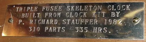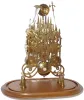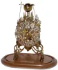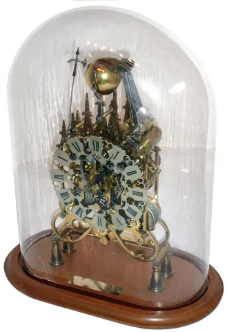Skeleton clock, modern reproduction 8 days, triple fusee with quarter-hour chime on 8 bells, 1982 the overall condition is very good, and the engraved plate on the wood base indicates that the maker needed 335 hours to construct this clock from a 310-part kit. The dome has a stable crack on one side. Overall height to top of dome 20"