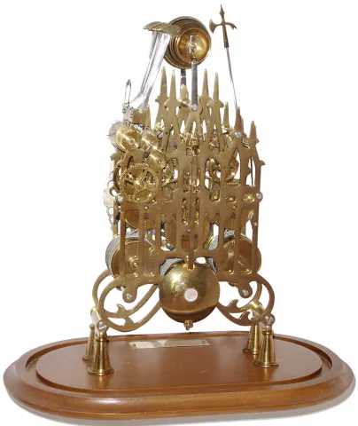 Skeleton clock, modern reproduction 8 days, triple fusee with quarter-hour chime on 8 bells, 1982