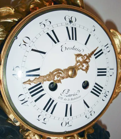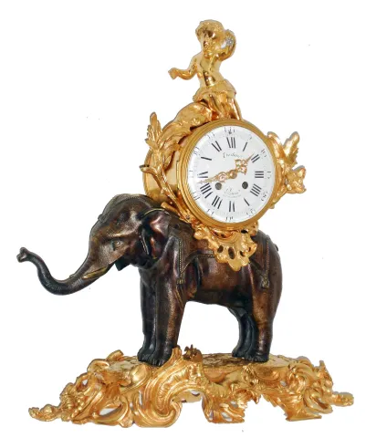 French figural clock, 8 days, time and count wheel strike pendule a Paris movement by Marti, contained in a gilt drum carried on the back of a patinated bronze figure of an elephant standing on a gilt bronze base with rococo style ornament, the drum with gilt foliage and seated figure holding a cluster of grapes, white enamel Roman numeral dial with Arabic outer 5 minute markers, signed "Costantin a Paris Grie de la Madeline", gilt Louis XV style hands, bezel with thick beveled convex glass, c1865 Case with gilding and patina restored, bezel glass good, rear glass missing, dial with a few tiny edge flakes, otherwise excellent, hands excellent, movement ticks and strikes, bell nut replaced, Ht 20 1/2"