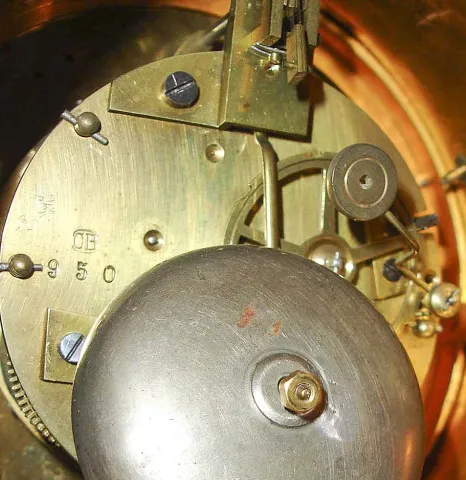 Case with gilding and patina restored, bezel glass good, rear glass missing, dial with a few tiny edge flakes, otherwise excellent, hands excellent, movement ticks and strikes, bell nut replaced, Ht 20 1/2"