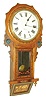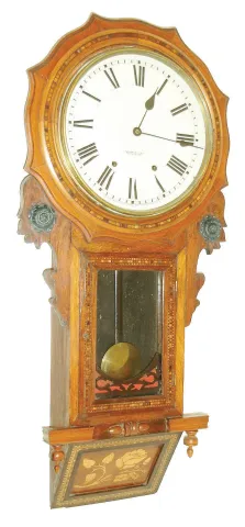Anglo-American, 8 day, time and strike inlayed long drop octagon wall clock, c1875 Mahogany and mahogany veneered and inlayed case with some veneer loss on the pendulum door. The panel on the beveled bottom might be a later replacement has the color of the frame does not match the rest of the case. Despite that it still looks attractive. The dial has been repainted and the "New Haven" name added. These clocks generally contain the movement imported from the U.S. and not the dial. Someone probably noticed the movement stamped with the New Haven Logo and had the dial painted to reflect that. Hands are original. Ht