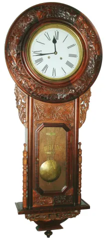 Asian carved wood modern reproduction 8 day time and strike wall clock, c1990 this elaborately carved case is in very nice original condition with no losses or damage. The glasses, painted metal dial, and grid-iron pendulum all are okay. Ht 55"