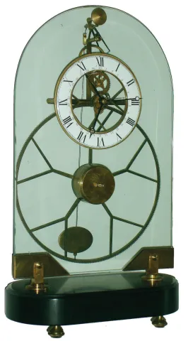 this reproduction is in good original condition, with an old looking patina on the brass. The thick glass and wood base are fine. The pinwheel escapement ticks but we did not test long-term. Ht 19.5"