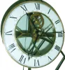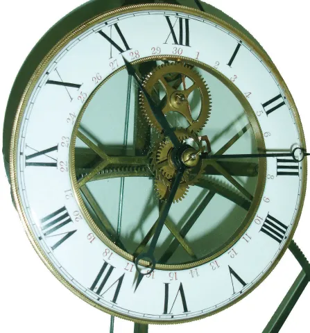 Asian reproduction of 8 day calendar skeleton clock with oversize great wheel, brass and glass, on ebonized wood base, (no dome), modern this reproduction is in good original condition, with an old looking patina on the brass. The thick glass and wood base are fine. The pinwheel escapement ticks but we did not test long-term. Ht 19.5"