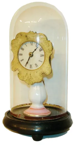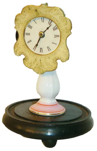 Candlestand clock, porcelain stand with pink band and striping at base, electroformed copper dial surround, Roman numeral white paper dial, steel spade hands, 30 hour timepiece movement, all under a glass dome and mounted to an ebonized, turned wooden base on ball feet, c1860 porcelain very good, dial surround and dial loose, hands with minor oxidation, runs, rocking figure missing from pallet arbor, base with minor surface losses, good dome, Ht 11" to top of dome